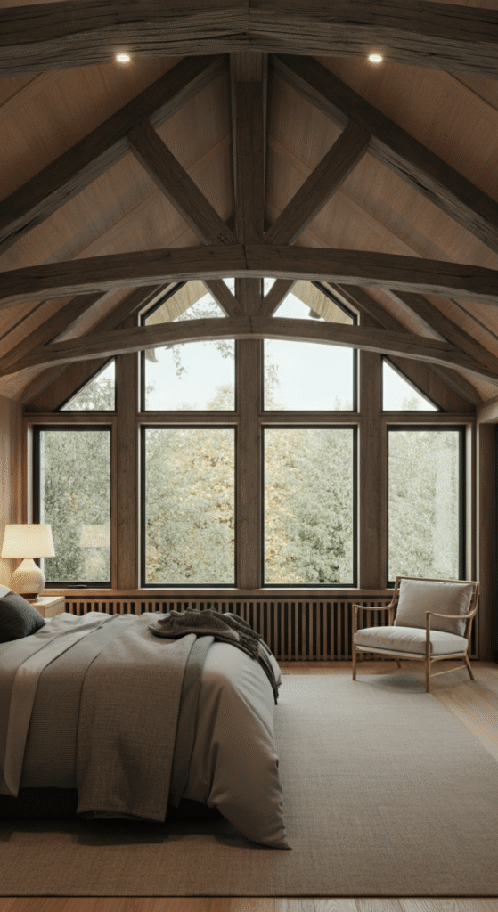 If you’re working with a bedroom that doesn’t have natural exposed beams, consider adding faux beams or wooden paneling that mimics this rustic feature. You’ll be amazed at how much warmth they add to the room.