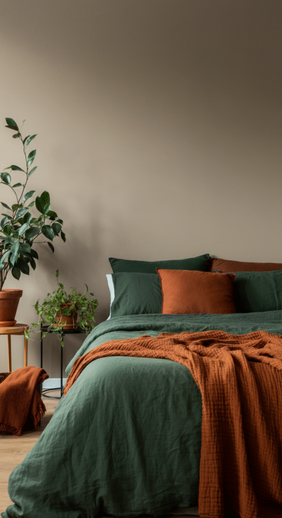 Earthy tones like soft beige, mossy greens, rusty oranges, and warm browns are ideal for creating a relaxing and grounded environment.