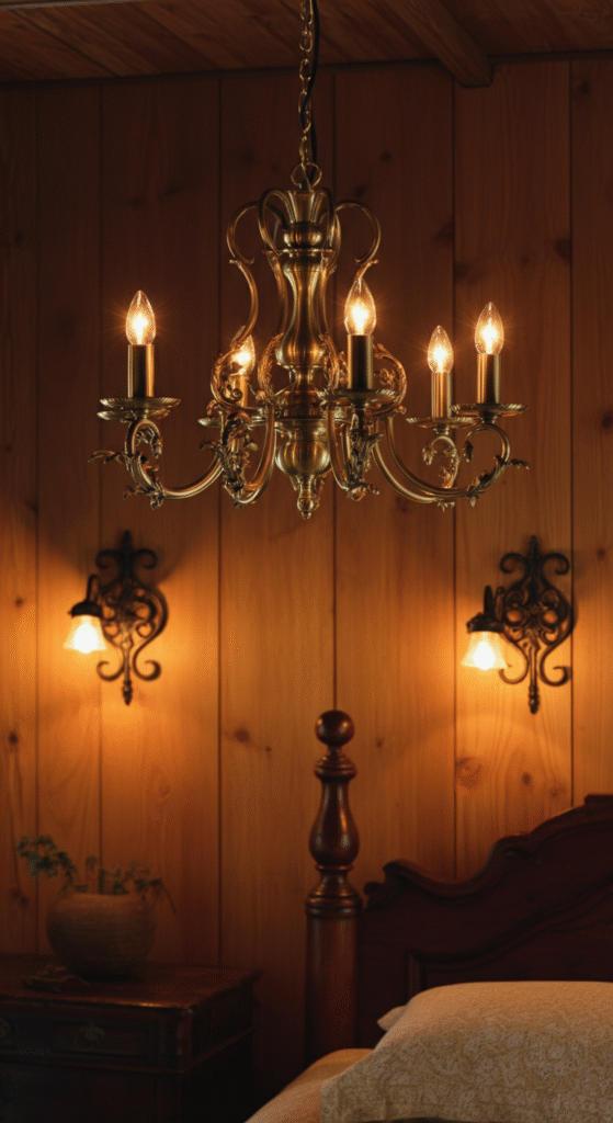 Vintage-style lighting, such as wrought iron sconces or antique chandeliers, works beautifully to create a warm and inviting glow in rustic spaces.