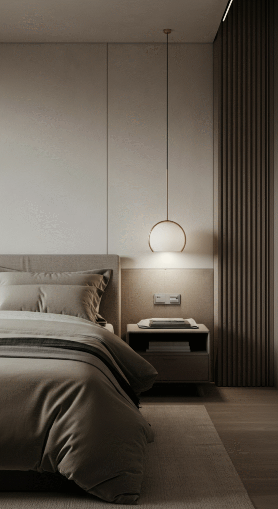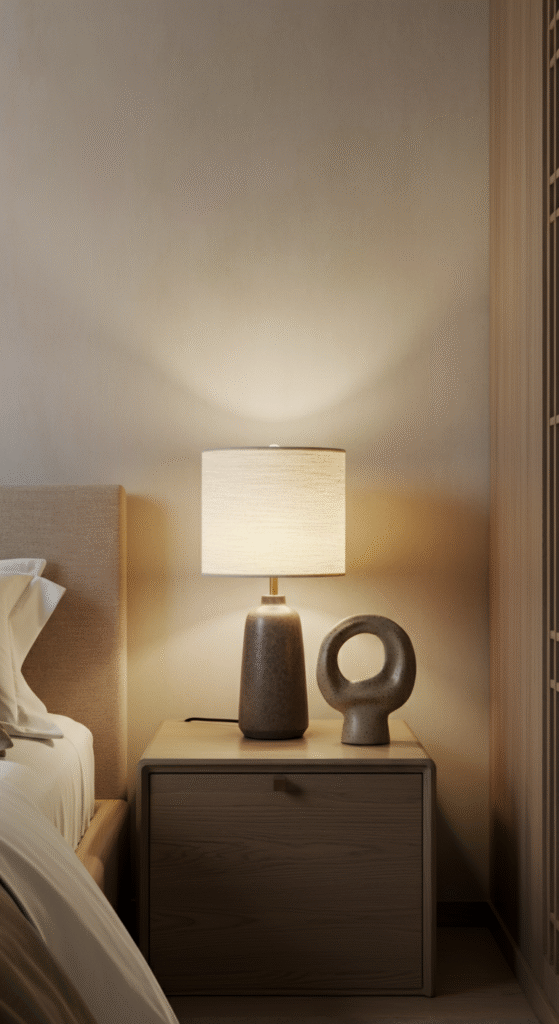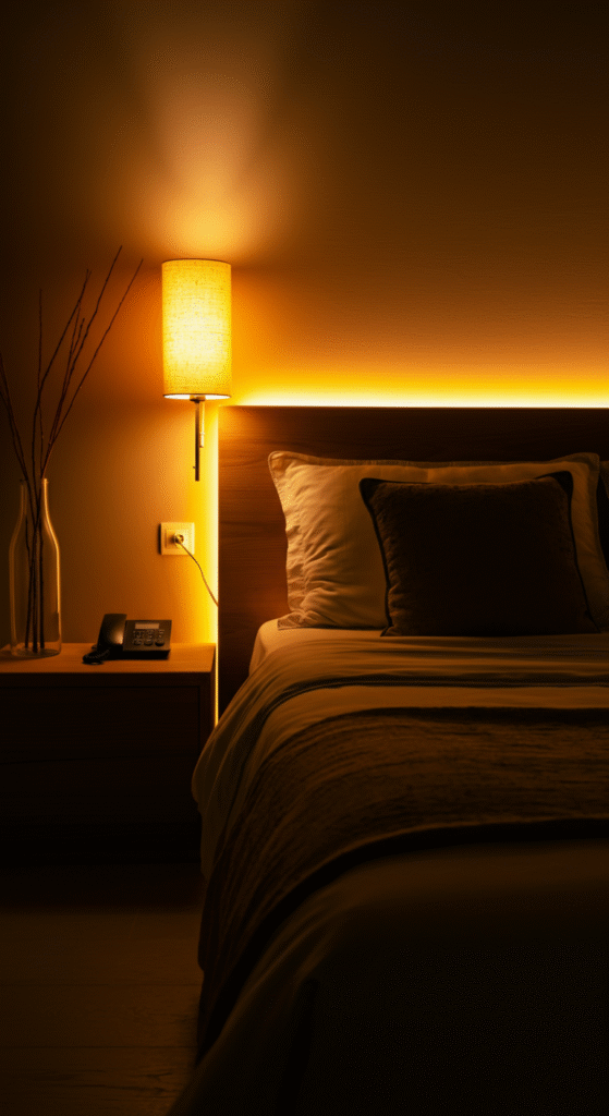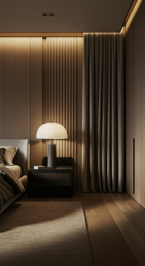 Bedside lamps with fabric shades, concealed LED strips behind headboards, or floor lamps with diffused glow allow the room to shift from functional to restorative.