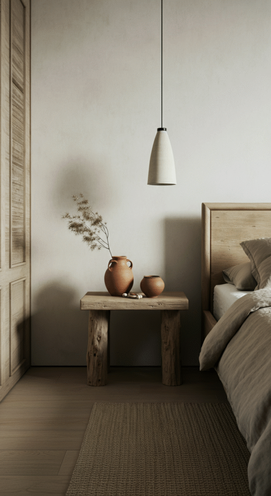 Choose wood with visible grain rather than glossy finishes. Linen bedding with a soft crumple adds quiet elegance. A stone bedside surface introduces weight and permanence.