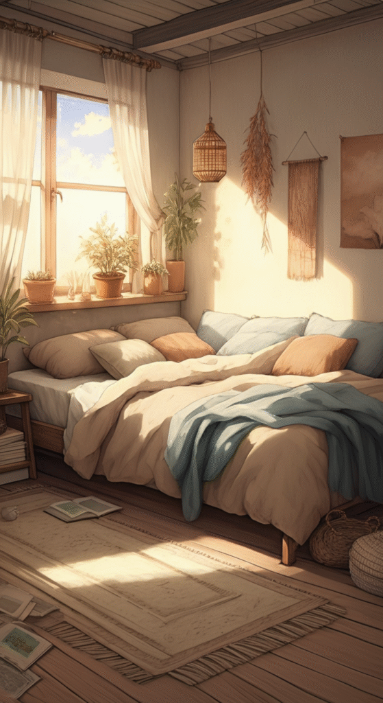 Anime worlds often feel warm, imperfect, dreamy, and human. Boho interiors thrive on the same energy. When combined, they create a bedroom that feels artistic, soulful, and quietly magical.