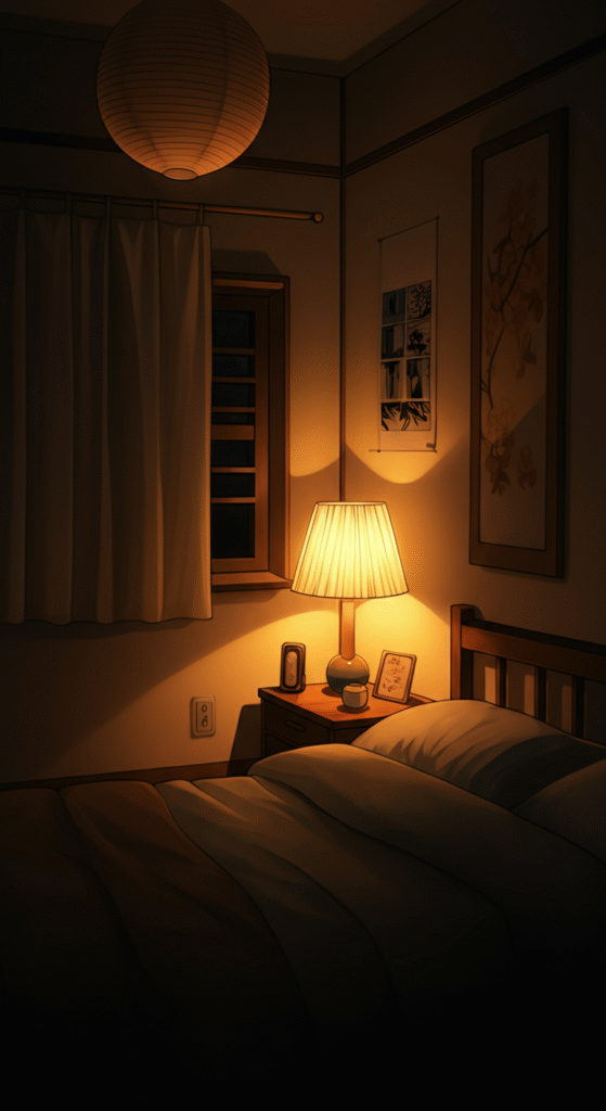 Lighting is essential. Warm, soft, layered lighting creates the cozy, cinematic atmosphere inspired by anime.