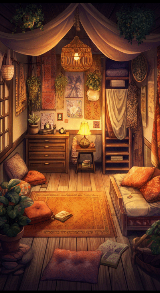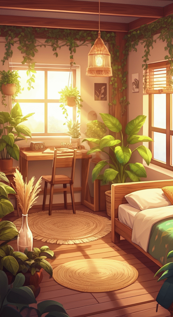 Anime frequently romanticizes evening light, glowing windows, warm lamps, and gentle shadows. Boho design embraces the same softness through layered, indirect lighting.