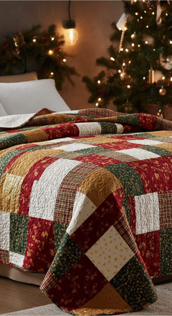 The patchwork quilt is a true Boho classic. It blends multiple colors and patterns, creating a quilt that feels like a quilted work of art. During Christmas, a patchwork quilt can feature traditional Christmas hues like red, green, gold, and white, or it can mix in non-traditional colors such as mustard, navy, and burnt orange for a more modern feel. The beauty of this quilt lies in its handmade look, with each square or rectangle telling its own unique story.