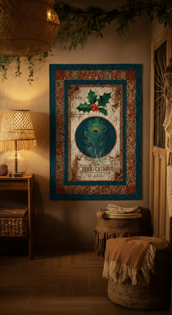 Why stop at quilts on your bed when you can hang one on your wall? A Boho quilted wall hanging can be the centerpiece of your holiday décor. This wall hanging might feature elaborate Christmas motifs, such as mistletoe, holly, or vintage Santa imagery, alongside intricate patterns typical of Bohemian design, such as mandalas or tribal motifs. The colors can range from metallics like gold and silver to deep, earthy hues like burnt orange and forest green.