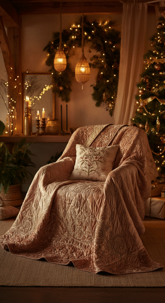 Handwoven textiles have been used for centuries around the world, from ancient Middle Eastern tapestries to European woven wall hangings. When paired with festive touches like holly or subtle star embroidery, these handwoven quilts serve as both practical and decorative elements in your home.