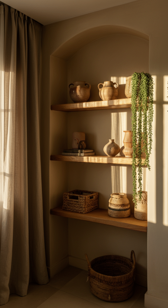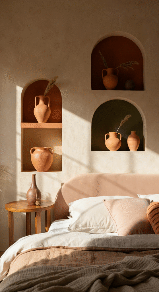 Paint the inside of each niche in warm terracotta, muted blush, or olive green for that earthy, sun-washed effect. Add clay vases, crystals, or woven lanterns for depth and interest.