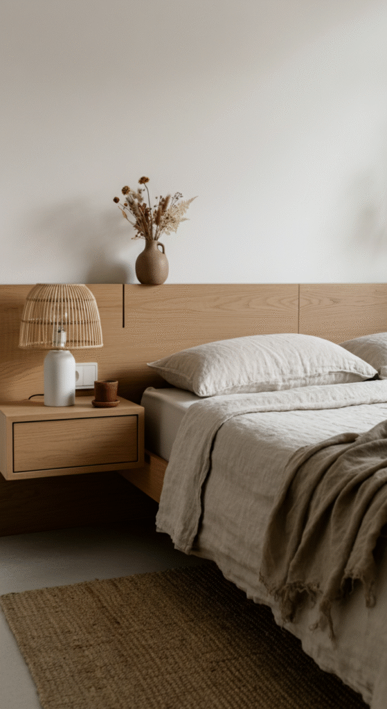 Built-ins don’t always have to be grand — even small details like floating nightstands can elevate your space. For a sleek yet earthy feel, opt for wall-mounted wood slabs or low, integrated ledges extending from the headboard.