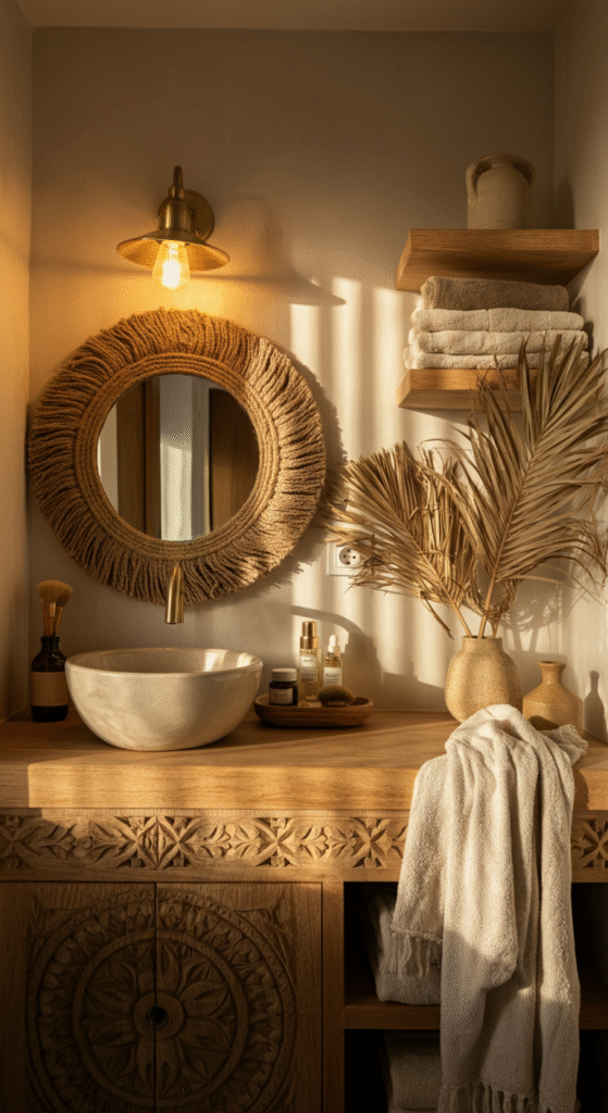 Turn your morning routine into a ritual by creating a built-in vanity that blends form and function. A carved wood countertop, open cubbies for skincare, and a round mirror framed in jute or brass can make your vanity area feel like a Moroccan spa.