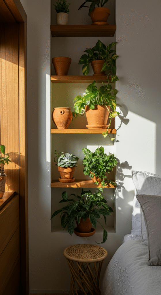 Create a vertical garden with open shelves near a sunny window, mixing hanging pots, clay planters, and trailing vines. The visual effect is serene and organic — like bringing a slice of the outdoors inside.