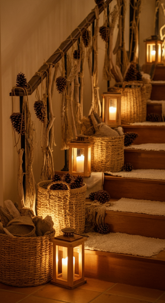 One of the core features of boho décor is the use of natural materials. Think of earthy tones, wooden elements, and organic textures that bring warmth to any space. To create an inviting and cozy Christmas staircase, start by layering textured rugs or woven baskets along the steps. Incorporating elements like rattan or wicker lanterns, twine garlands, or even driftwood will evoke that earthy, rustic charm.
