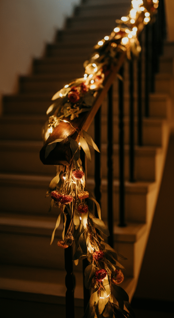 Boho is all about creating a cozy, dream-like ambiance, and there’s no better way to do this than with twinkling string lights. Drape fairy lights or globe lights along your staircase banister or over garlands to create a soft, glowing effect. The key is to keep it subtle—just enough to cast a warm, ethereal glow without overwhelming the space.