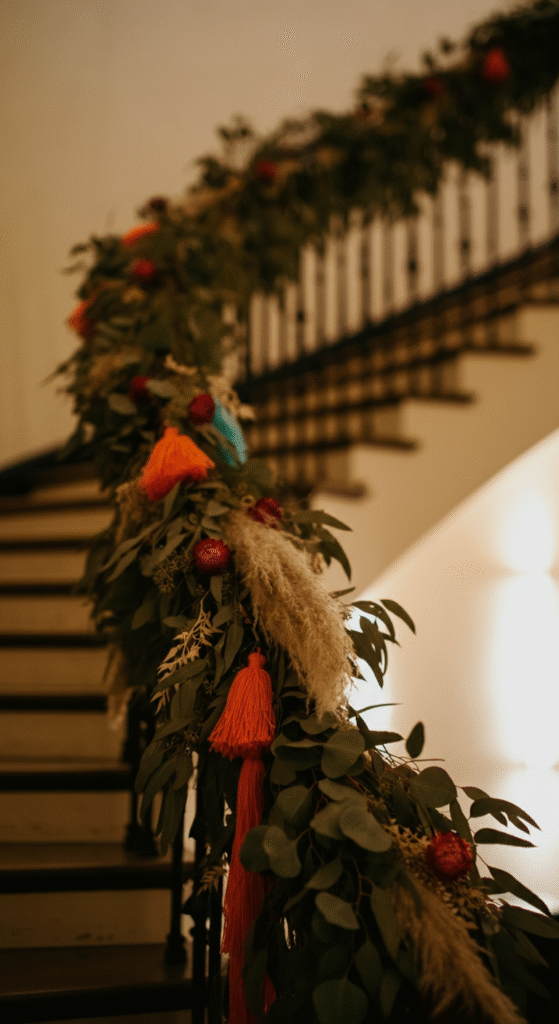 Traditional garlands are often made of pine or fir, but in boho décor, you can take this a step further. Create a bohemian-inspired garland by combining dried flowers, pampas grass, eucalyptus, and pinecones. Mix in colorful tassels or feathers to create a relaxed, eclectic look that’s both festive and chic.