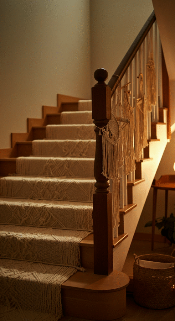 Incorporate textured elements like woven baskets, macramé garlands, and layered rugs. These add depth and warmth to your staircase while enhancing the boho feel.
