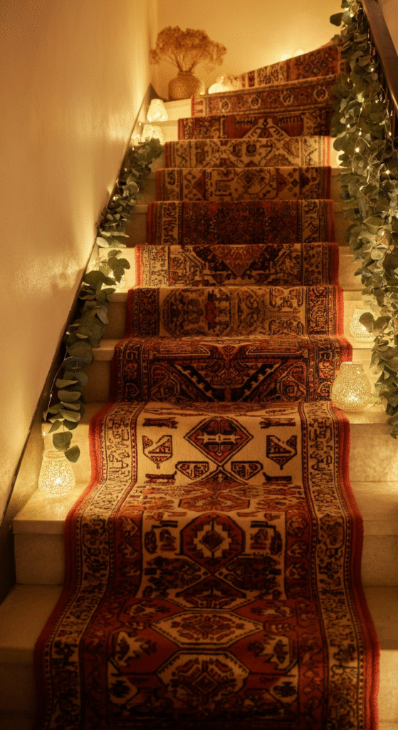 Add extra texture and warmth by layering boho-inspired rugs on the staircase. A collection of small, patterned rugs or runners can make your staircase feel like a cozy retreat. Choose rugs in neutral tones or earthy patterns like Aztec prints or Moroccan designs to elevate the look while maintaining that laid-back boho vibe.