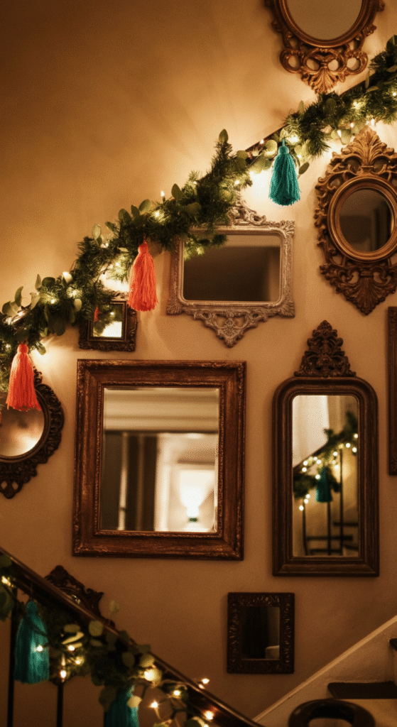 Mirrors are often used in boho décor to add light and dimension to a space. Consider hanging vintage or ornate mirrors along your staircase walls, which will not only make your space feel larger but will also add a bohemian, reflective touch. Look for mirrors with wooden or metallic frames to keep that boho edge while enhancing the holiday glow.