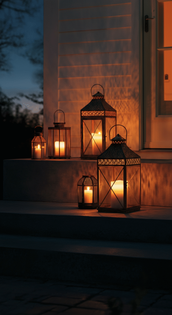 Place several lanterns along the steps or on either side of the door for an elegant, welcoming display. Inside each lantern, use battery-operated candles for a safe and long-lasting glow. Or, if you’re feeling traditional, real candles will add that extra touch of nostalgia, but be sure to keep an eye on them.
