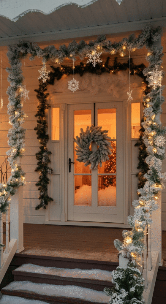For a more dramatic effect, you can even use faux snow along your porch railings or on the ground around your entryway. This creates a dreamy, snow-covered scene that looks just like a Christmas card.