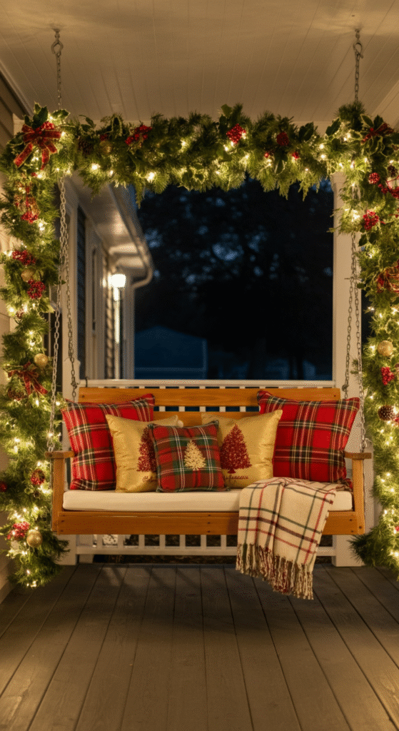 6. Cozy Porch Swing with Holiday Throws