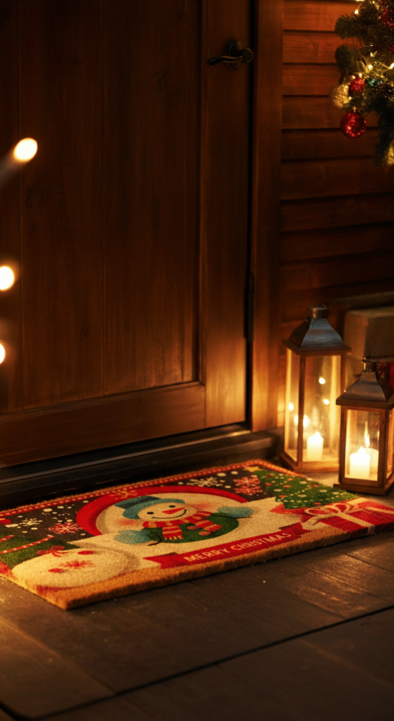 A simple yet effective way to add holiday cheer to your porch is with a festive welcome mat. Choose one with a Christmas-themed design, such as a snowman, Christmas tree, or the classic phrase “Merry Christmas.” A cheerful welcome mat sets the tone for your front porch and gives your guests a warm, festive greeting as they arrive.