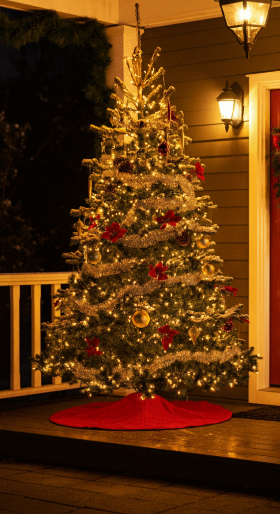 Decorate the tree with traditional ornaments, fairy lights, and perhaps a few bows to match your overall porch decor. A tree on the porch will instantly add a touch of elegance and festive flair, making your home feel even more welcoming to visitors.
