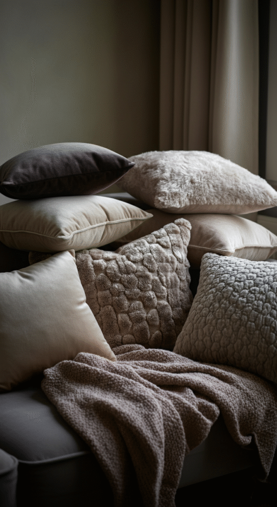 Nothing says cozy like a pile of soft throw pillows and blankets. They not only add visual interest but also provide comfort and warmth. Choose pillows and blankets in rich fabrics like velvet, chenille, or knit for added texture.
