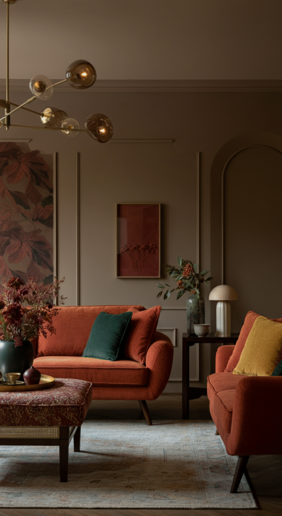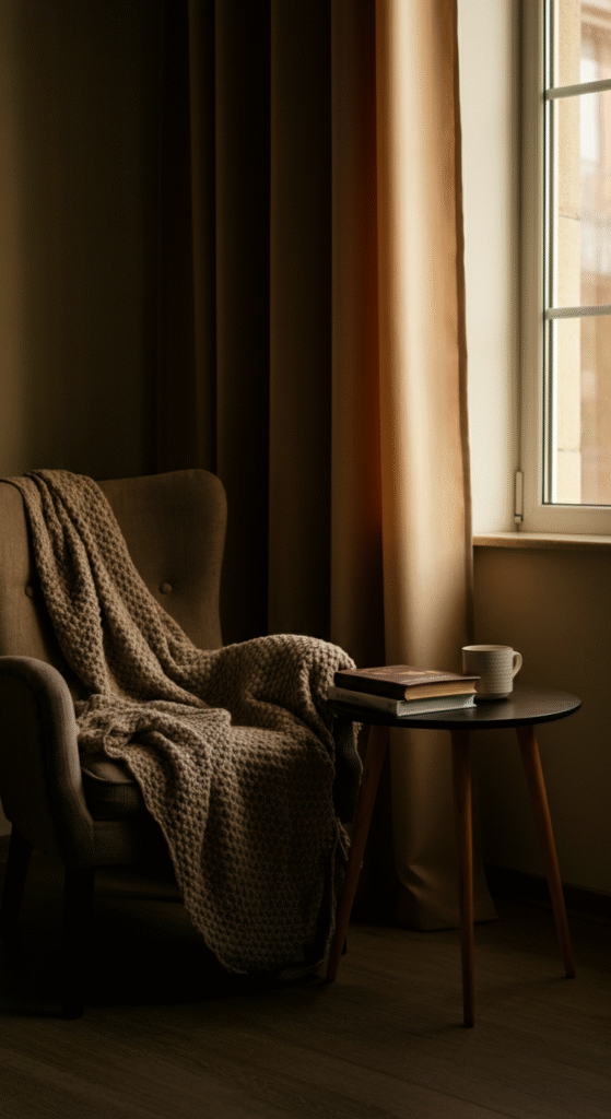 Warm, earthy tones are ideal for creating a cozy atmosphere. Colors like beige, terracotta, mustard yellow, rich brown, and deep greens can make a space feel inviting. For a balanced look, pair these warm shades with neutral tones to keep the room feeling grounded and cozy.