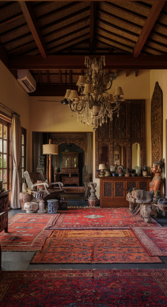Imagine walking into a living room that feels like a world tour—Moroccan rugs underfoot, Balinese carvings on the walls, and a French chandelier overhead. This globally inspired villa living room captures the essence of travel without ever stepping outside your door.