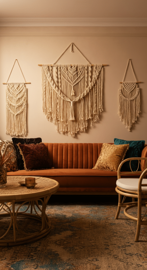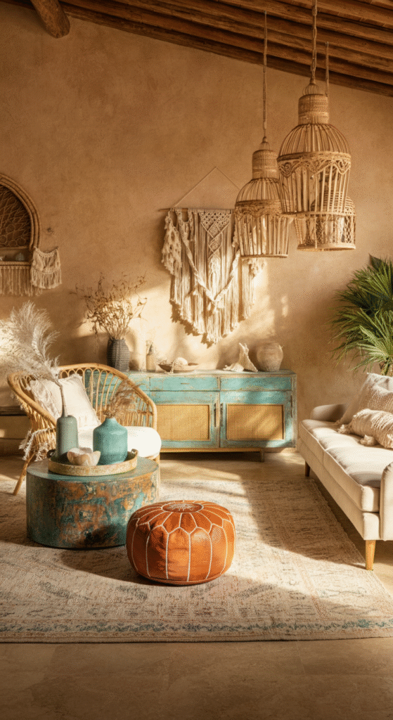 If bohemian charm met luxury, this would be their love child. Think plush velvet sofas, macramé wall art, layered rugs, and golden accents glinting in the sunlight.
