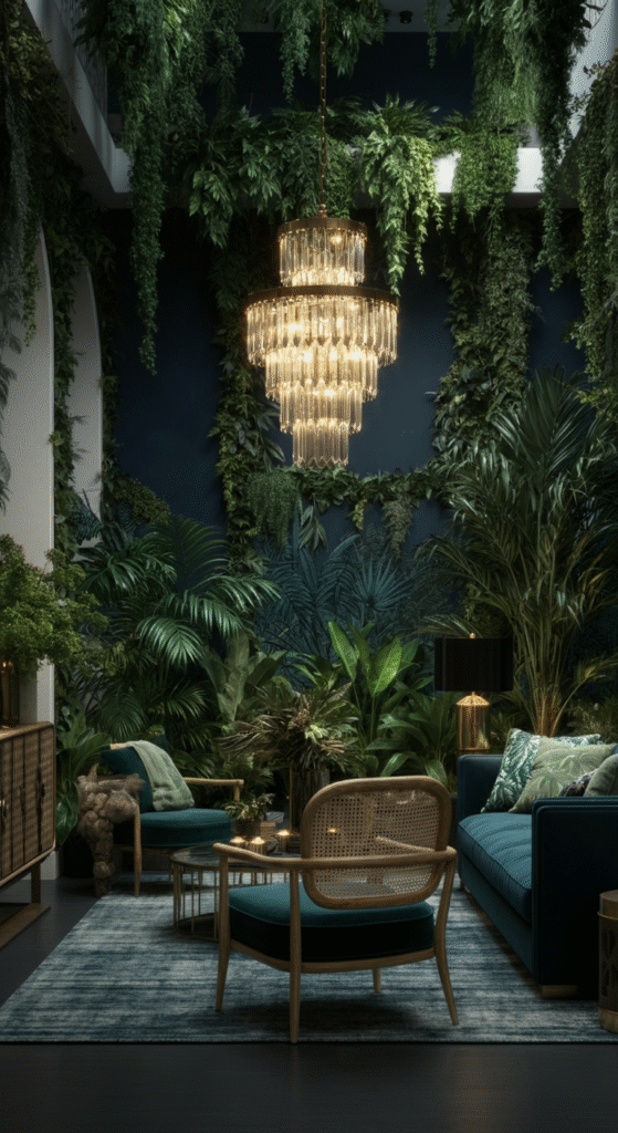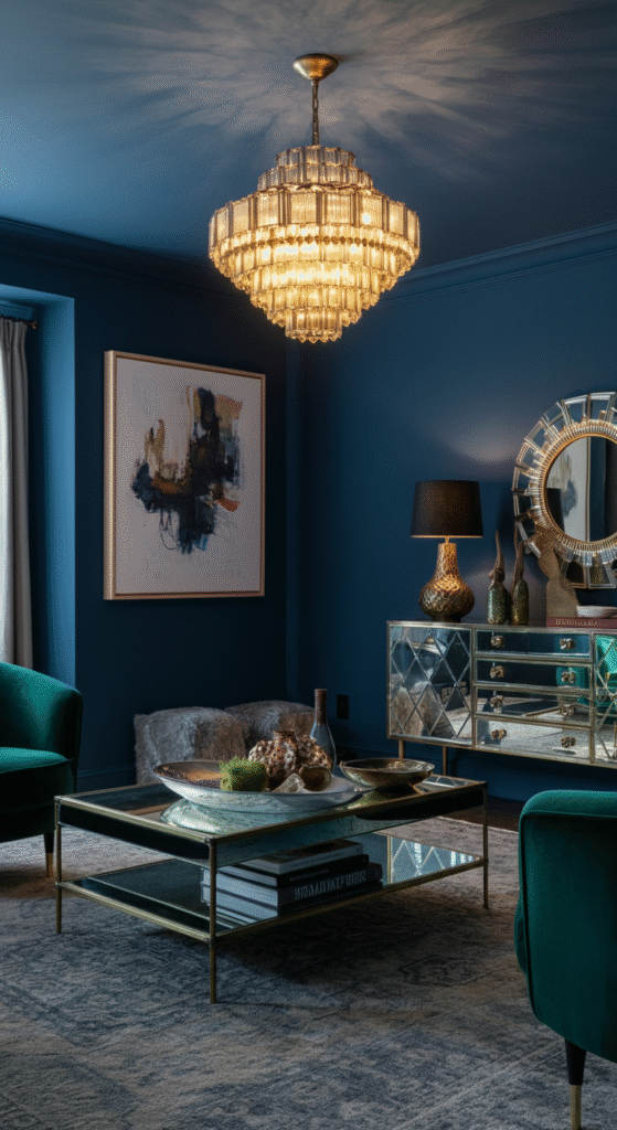 Picture velvet armchairs in jewel tones, mirrored coffee tables, and crystal chandeliers paired with abstract art. The trick here lies in mixing eras seamlessly: a 1920s-inspired light fixture can pair beautifully with a 1960s Eames chair if balanced by color or material.