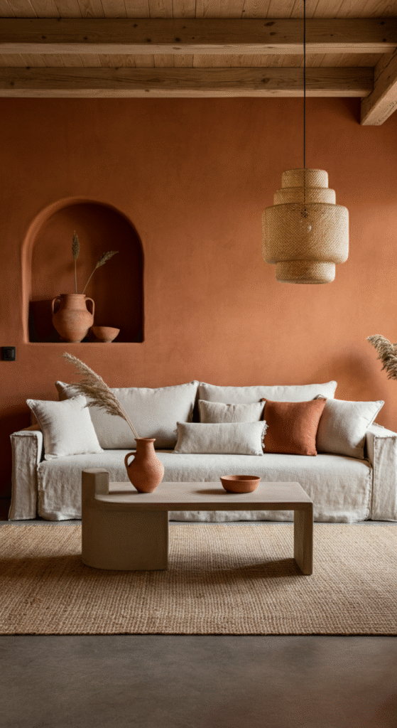 Think terracotta walls, linen upholstery, jute rugs, and wooden beams exposed in their rustic glory. Add hand-thrown pottery, woven textures, and clay accents for an organic touch.