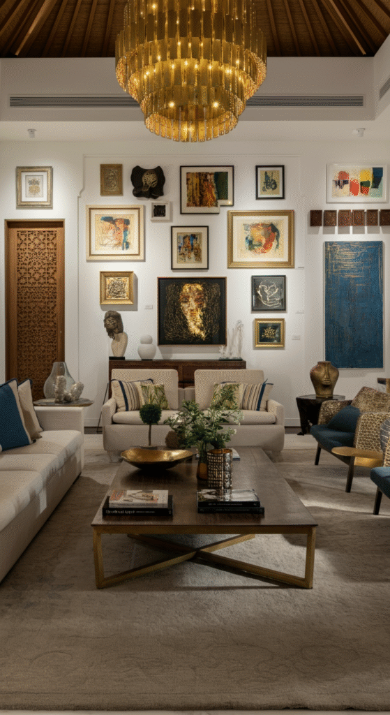For those who believe walls should do more than divide—they should inspire. The Art Lover’s Eclectic Villa transforms the living room into a curated gallery.