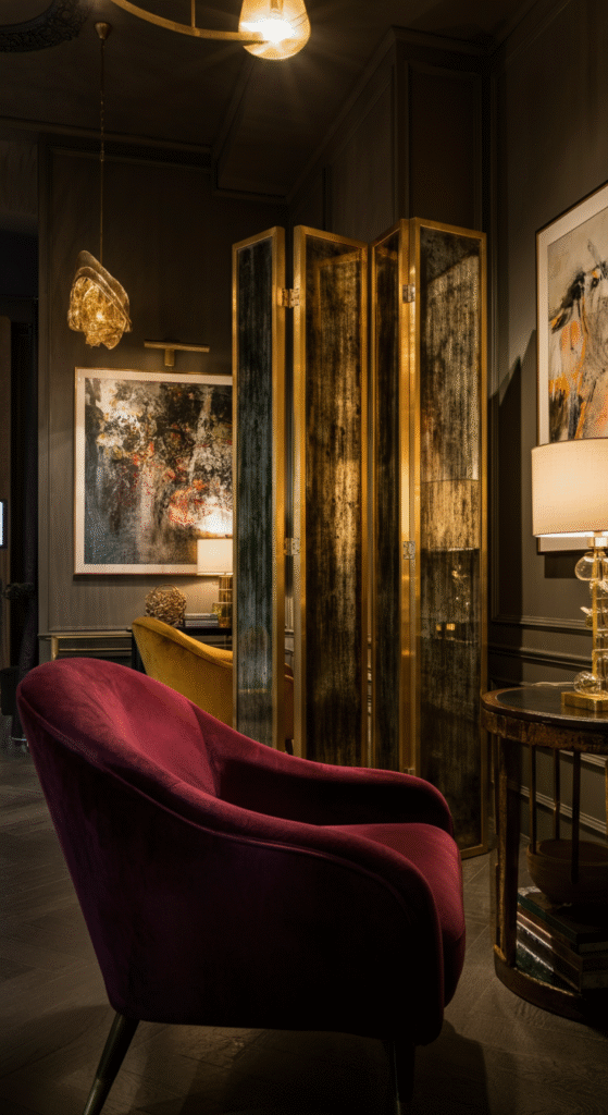Room dividers have made a striking comeback, but this time, they’re dripping in style. From velvet-paneled screens to gilded metal frames, they bring vintage glamour with a modern twist.