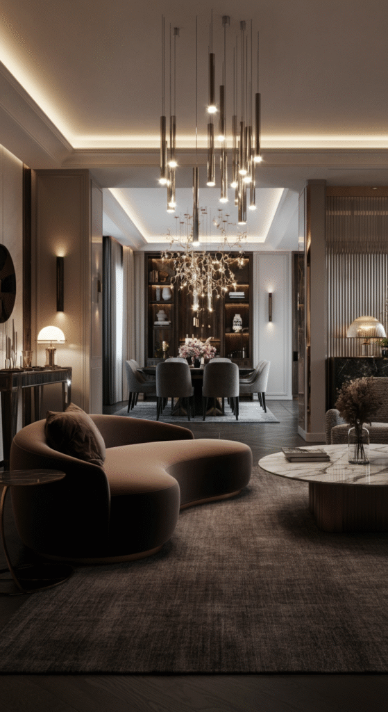 Think of a crystal chandelier defining the sitting area, pendant lights over the bar zone, and sculptural floor lamps accenting a reading nook. The play of shadows and highlights subtly guides movement through the space.