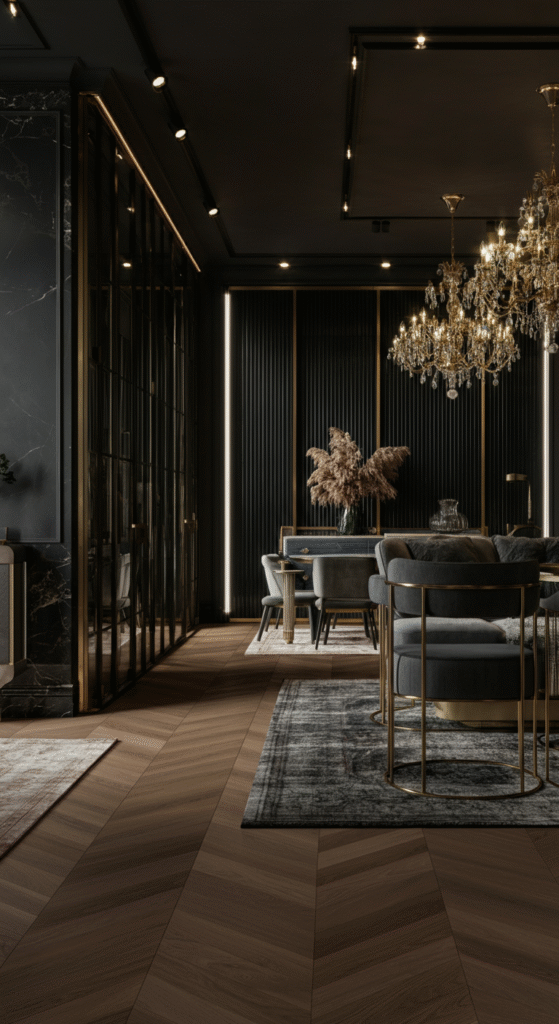 A glam approach involves symmetry, plush materials, and statement pieces. Picture a velvet sectional creating a cozy lounge on one side, and a mirrored console table marking a transition to the dining zone.