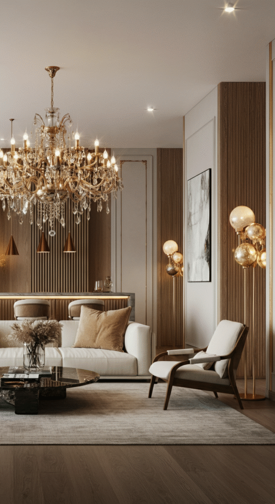 Metallic fixtures—especially in gold, chrome, or brass—instantly infuse glamour. Pair these with dimmers for mood flexibility. The key lies in layering ambient, task, and accent lighting so every part of your living room feels intentional and luxurious.