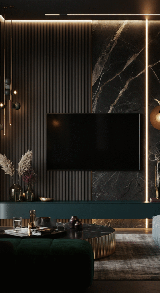 Wainscoting, fluted panels, or wallpaper with bold patterns can give each area its own personality. For example, a marble-effect accent wall behind the TV unit could define the entertainment area, while soft suede panels behind a chaise create a serene reading nook.
