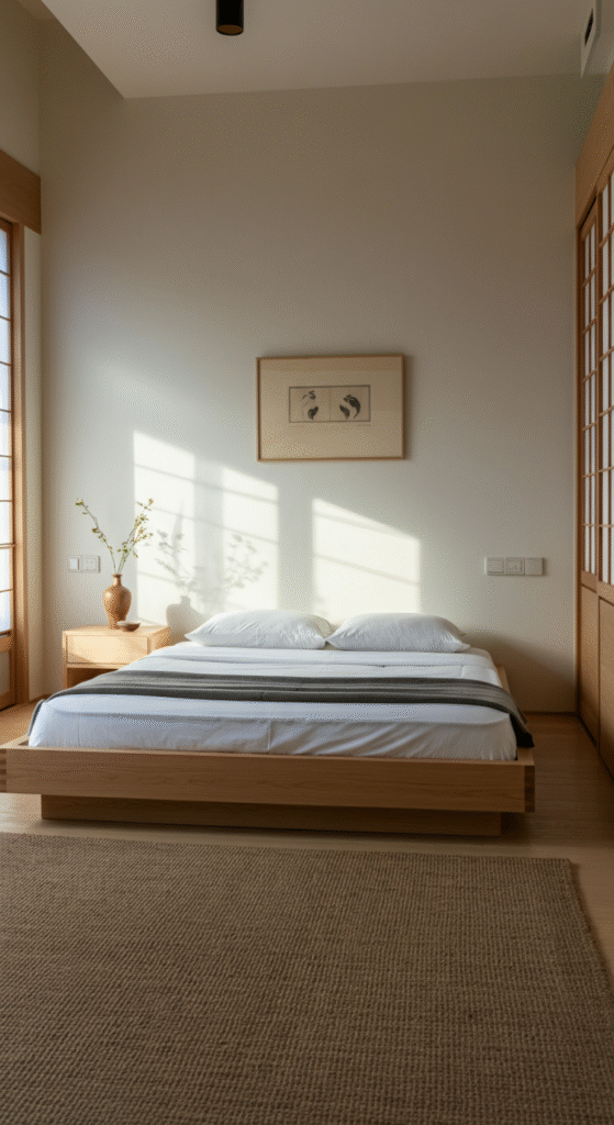One of the biggest Japandi secrets is the use of low furniture. Low beds, low side tables, low benches. Why? It creates more vertical breathing space and gives the illusion of a larger, calmer room.