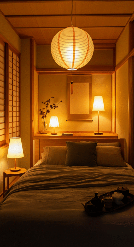 If there’s one thing that kills Japandi mood instantly, it’s a bright ceiling light blasting down on everything. Soft layered lighting is the heart of relaxation.