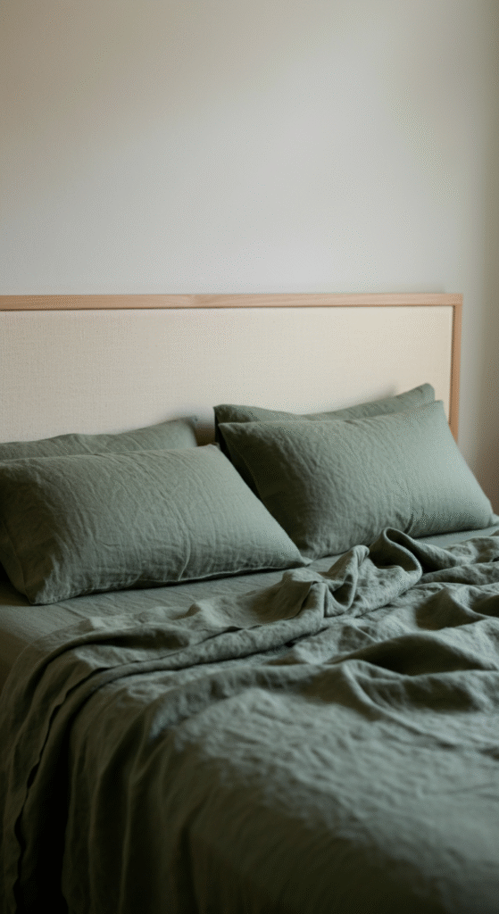 Japandi style does not like flashy patterns. However, the trick is to bring texture instead of prints. A green textured duvet cover or washed linen bedsheet creates a cozy contrast without breaking the minimal vibe.