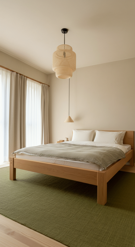 Every Japandi bedroom needs one element that ties the entire room together. A rug in olive green or moss green does that effortlessly.