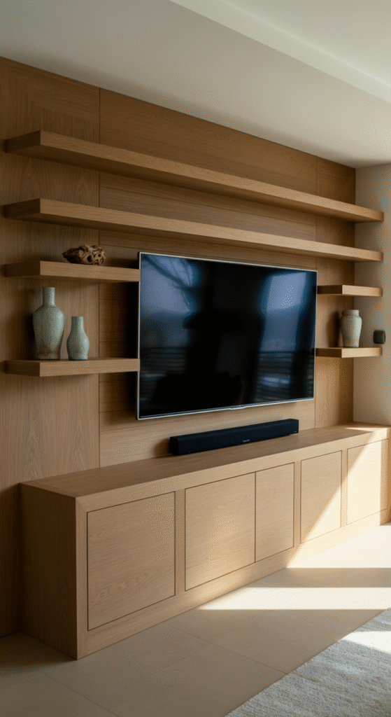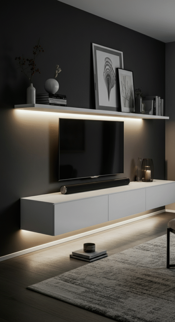 One of the most modern and luxurious ways to design your entertainment center is with floating units. These sleek, wall-mounted shelves or cabinets create a minimalist aesthetic and give the illusion of more space, making the room feel larger and airier.