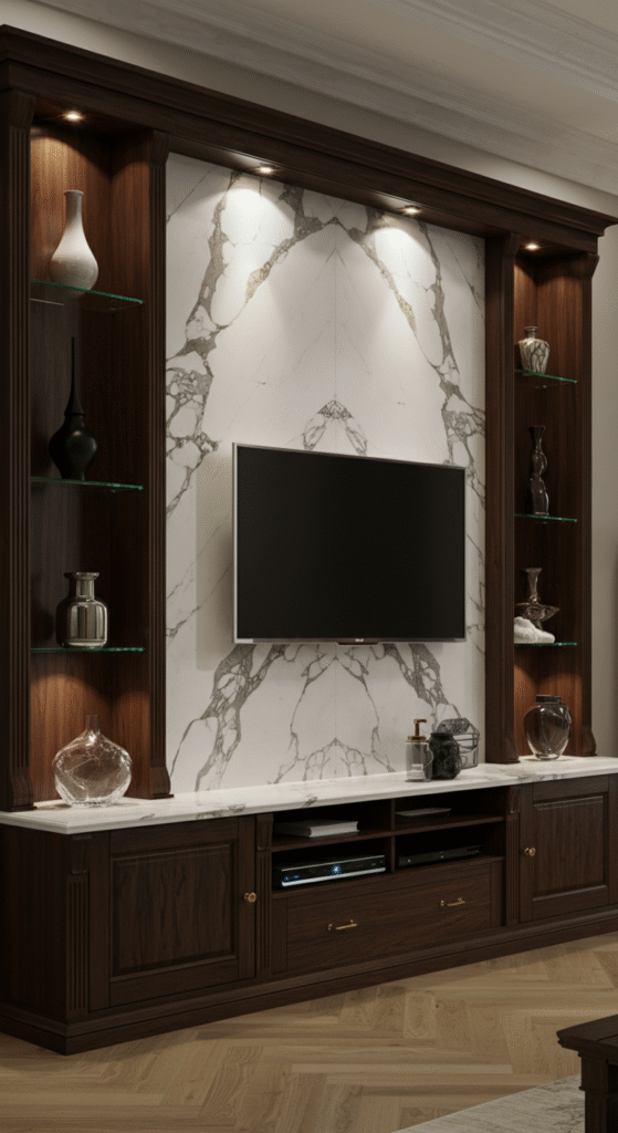 The best material depends on your desired style. For a timeless and elegant look, wood and marble are top choices. For modern designs, floating units and glass or metal accents work well. Custom-built entertainment centers offer the flexibility to choose a variety of materials that match your home’s aesthetic.
