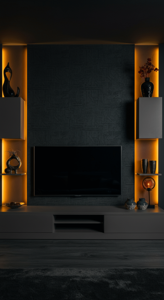 Choose a bold pattern or a rich, tactile texture that complements the rest of your room’s design. Pair this with custom shelving that highlights your favorite art pieces or collectibles, and you’ve got a luxury entertainment zone that’s both functional and visually striking.