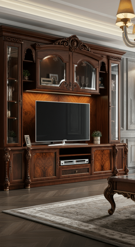 A vintage-inspired entertainment center can feature old-world charm, like wooden cabinets with ornate detailing, paired with modern elements like high-tech speakers and flat-screen TVs.