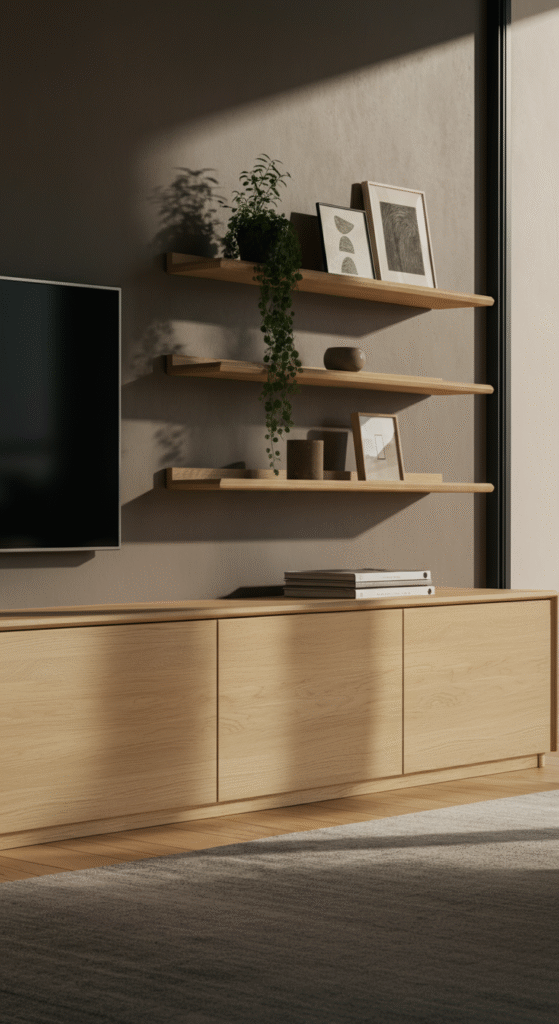 The minimalist approach focuses on functionality, with just enough storage space to keep things tidy while still showcasing your TV, sound system, and decorative accessories.