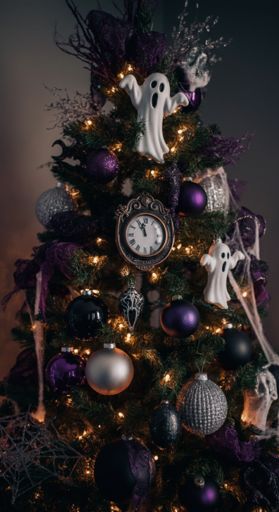 For those who love a spooky, yet stylish holiday season, the Haunted Mansion tree is a showstopper. Inspired by the eerie charm of Disney’s haunted attraction, this tree is adorned with ghostly ornaments, vintage-style clock faces, and cobwebs. Dark, muted colors like black, deep purples, and silver set the perfect ghostly mood for a chilling Christmas.