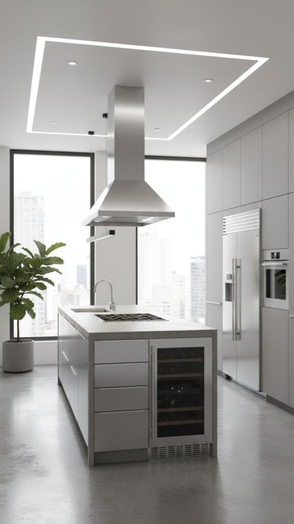 For kitchen islands, nothing says “modern luxury” quite like a cylindrical tube hood. These slender, tubular units drop down from the ceiling like a pendant light. They are perfect for maintaining sightlines across the kitchen because they are far less bulky than traditional island canopies.