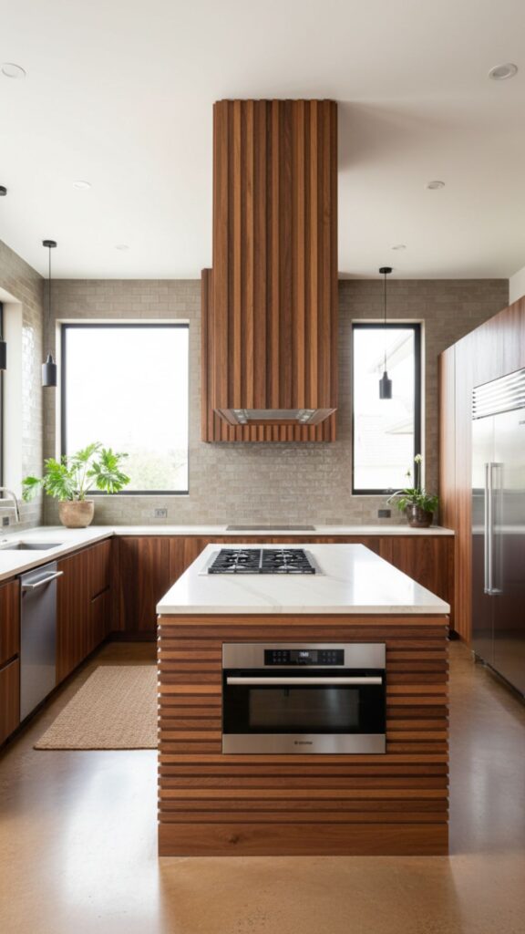 Modern doesn’t have to mean cold. Adding a wood-clad hood brings warmth and organic texture to kitchens dominated by stone and steel. Slatted wood designs or flat-panel walnut veneers are particularly popular in mid-century modern and Japandi styles.